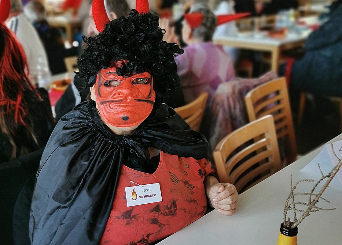8. 11. 2022 jsme s paní ředitelkou a panem Vítů, který řídil auto, vyjeli o půl osmé do Domova seniorů v Sedlčanech. Tam se otevřela v 9 hodin brána pekelná. Krásné čertice nás přivítaly opečeným špekáčkem na čertovském ohni. Nejen všichni účastníci byli v čertovských kostýmech, ale i personál a studenti, kteří přišli jistit pekelné hrátky. Samozřejmě byla i ďábelská nálada. Zúčastnily jsme se čertovských soutěží, byla to pekelná mela o dort čerta 1. kategorie. Jídla bylo dostatek, dokonce se podával Belzebukův mls (knedlíčková polévka, bramborový salát a řízek). Po obědě proběhlo vyhlášení vítězů – také jsme převzaly v taškách dárky. Ještě jsme se mohly zúčastnit rohatého tanečku, ale bohužel jen chvilku, protože nás čekala dlouhá cesta zpět.