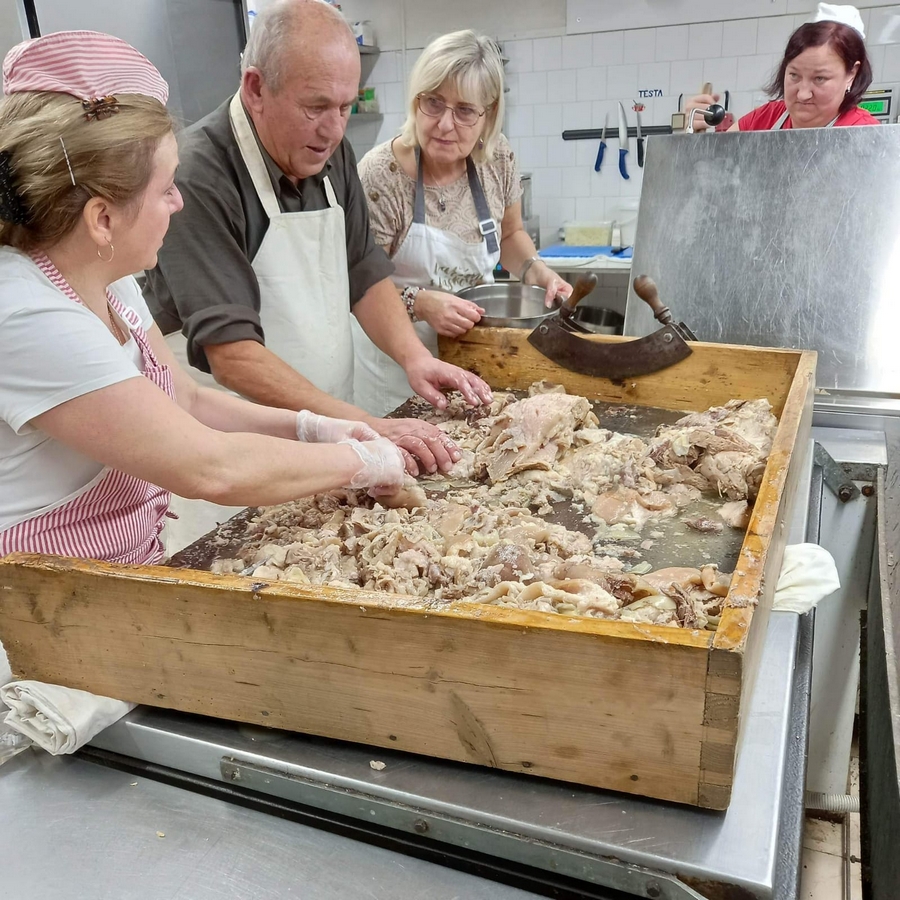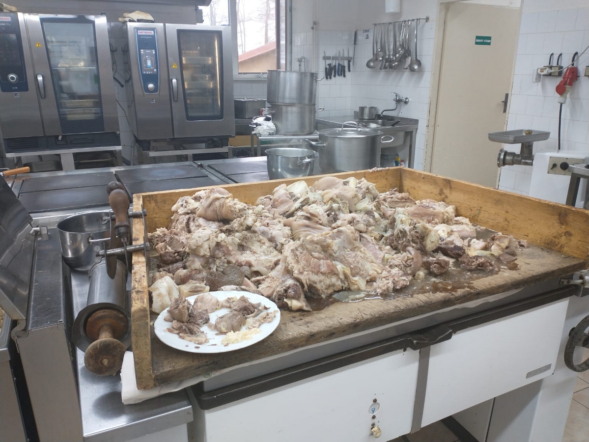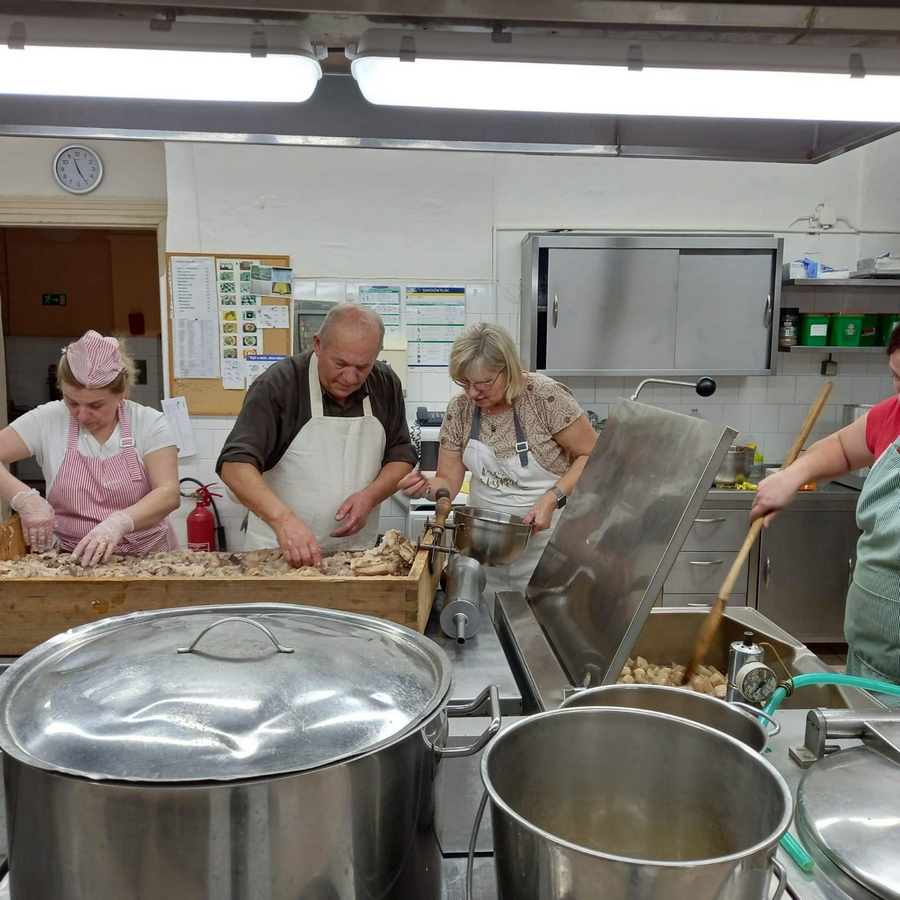 V květnu 2022 nám zapsaný spolek Hrádeček zakoupil malé selátko. Po dohodě se sousedem panem Švolbou jsme se domluvili, že nám pomůže s jeho chovem a začal ho poctivě krmit. Vykrmil ho téměř na 160 kg. Následovalo jednání s panem Holubem, který v Červeném Hrádku provozuje jatka. Po kontrole Státní veterinární správou nastal den „D“. 11. ledna 2023 se kuchyň proměnila v pravé zabíjačkové hody. Vše řídil emeritní ředitel z domova seniorů Hačka Pavel Škarda ve spolupráci s kuchařkami a paní ředitelkou.