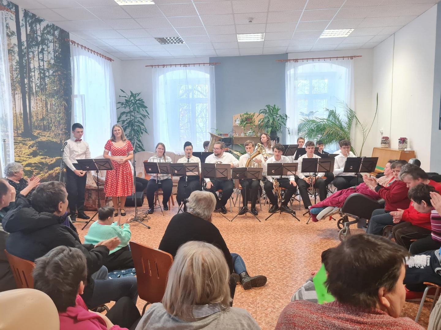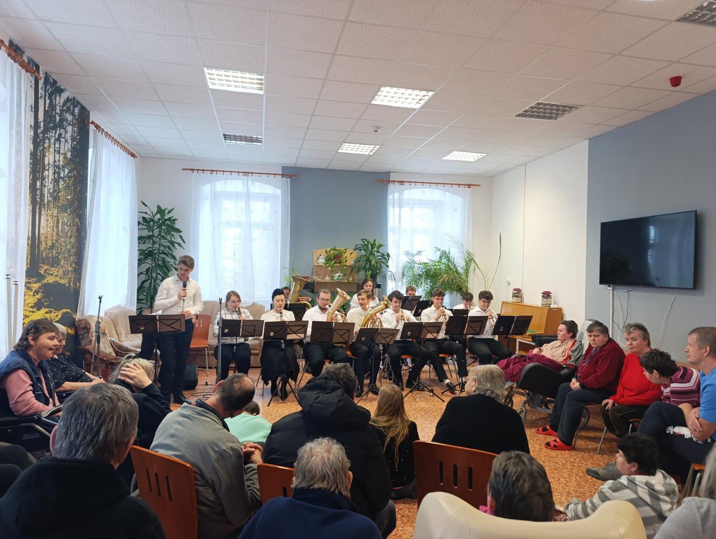 V rámci projektu Ježíškova vnoučata se 3. 2. 2026 uskutečnilo výjimečné hudební vystoupení, které přineslo radost, nostalgii i společné zpívání. O nezapomenutelný zážitek se postarala dechová kapela Rejdišťanka z Pražské konzervatoře, která dorazila v obsazení dvanácti mladých hudebníků doplněných o zpěváky a zpěvačku.